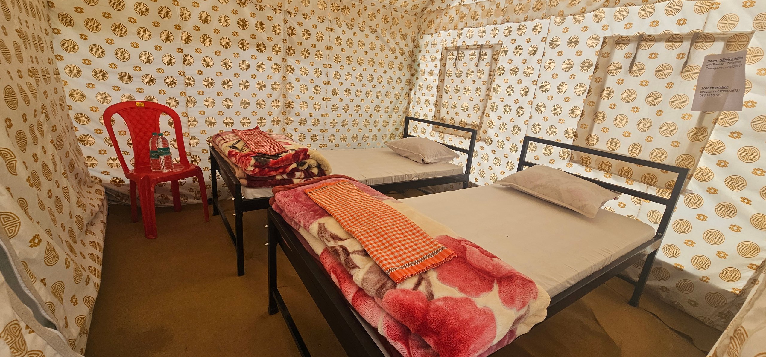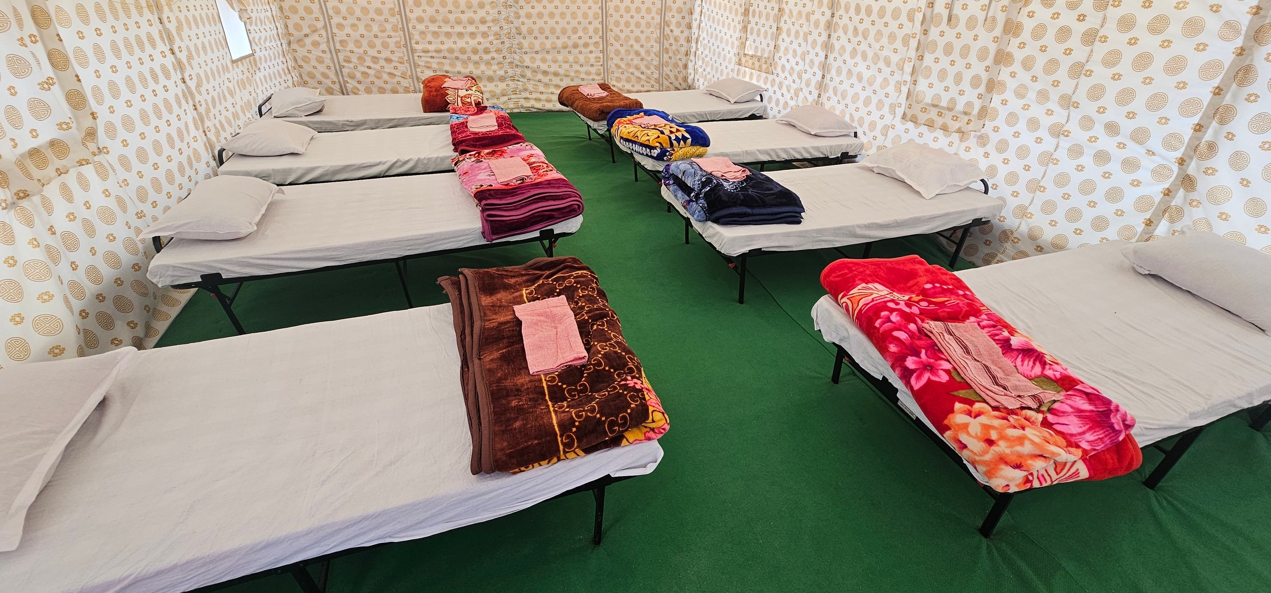 A communal suite with 1 single bed amongst 8 other single beds in a large dormitory.