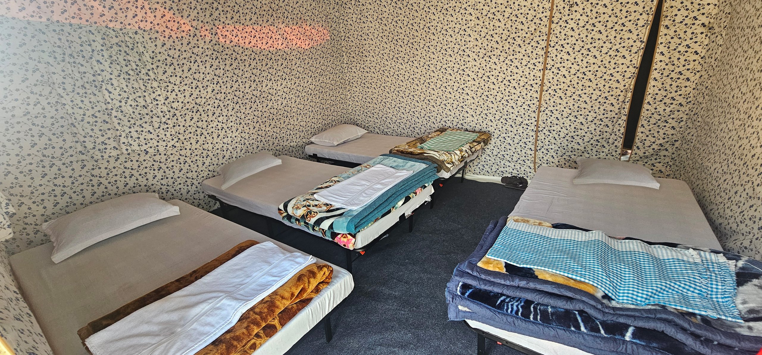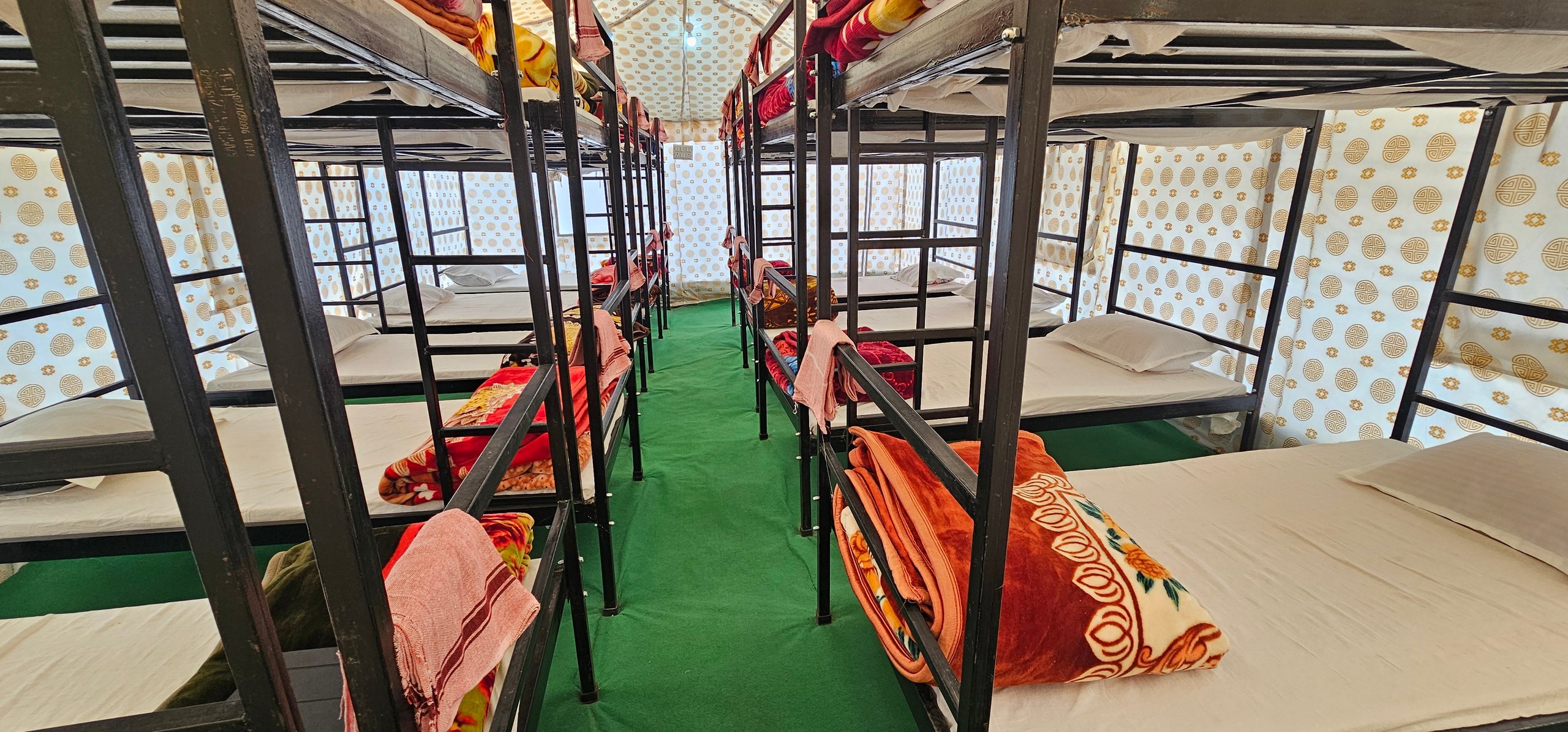 A communal suite with 1 single bed amongst 8 other single beds in a large dormitory.